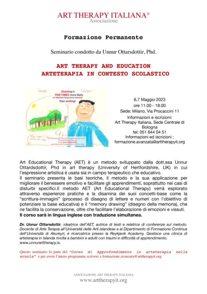 Dr. Unnur Ottarsdottir will teach the course Art Therapy and Education at Art Therapy Italiana in Milan, Italy 6-7 May 2023 at 11.00 – 18.00. The course is intended for art therapists who work in schools. Further information is provided through email: formazione.avanzata@arttherapyit.org and by phone: +39 (0) 51 644 04 51. The maximum number of participants is 15. The course will be held in English with simultaneous translation.