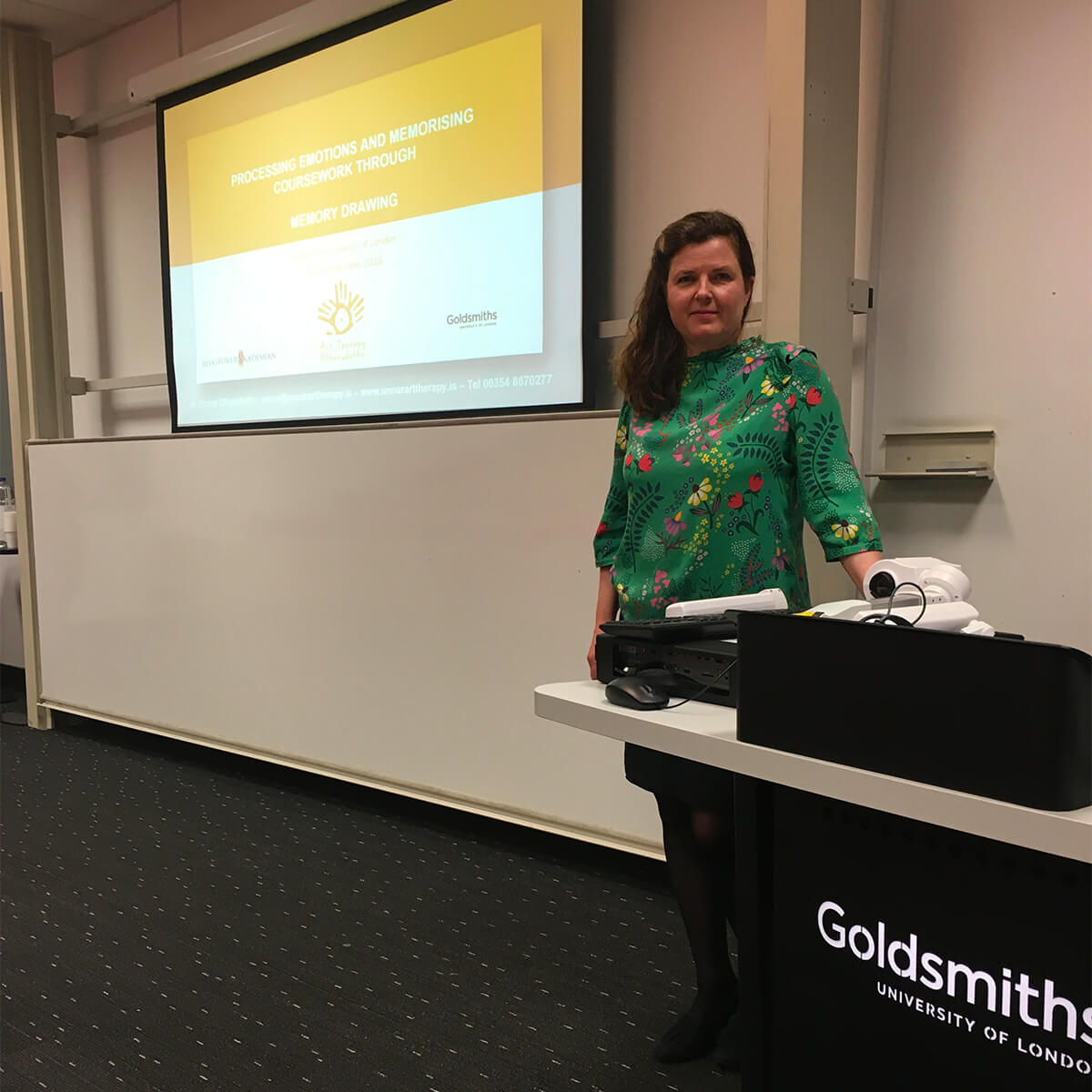 2019 Processing Emotions and Memorising Coursework through Memory Drawing. The American Art Therapy Association Conference. Celebrating 50 Years of Healing Through Art. Kansas City, MO. 2019 Processing Emotions and Memorising Coursework through Memory Drawing. The International Practice/Research Conference. Queen Mary’s University, London. 2018 Research on Processing Emotions through Memory Drawing. Open public lecture at University of Goldsmiths, London. 2018 Processing Emotions and Memorising Coursework through Memory Drawing. Four open public lectures at the Reykjavik Academy, Reykjavik.